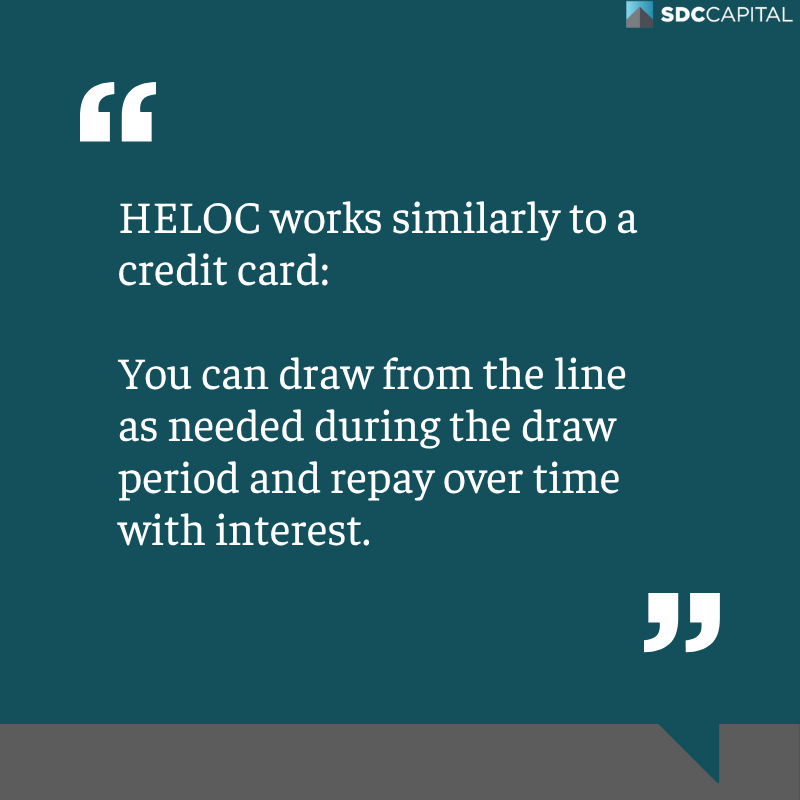 It works similarly to a credit card: You can draw from the line as needed during the draw period and repay over time with interest.