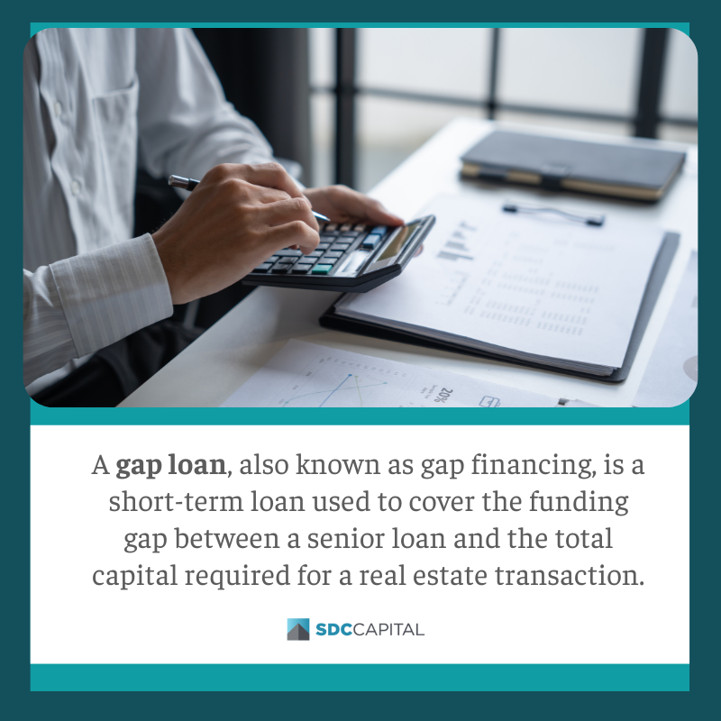 A gap loan, also known as gap financing, is a short-term loan used to cover the funding gap between a senior loan and the total capital required for a real estate transaction.
